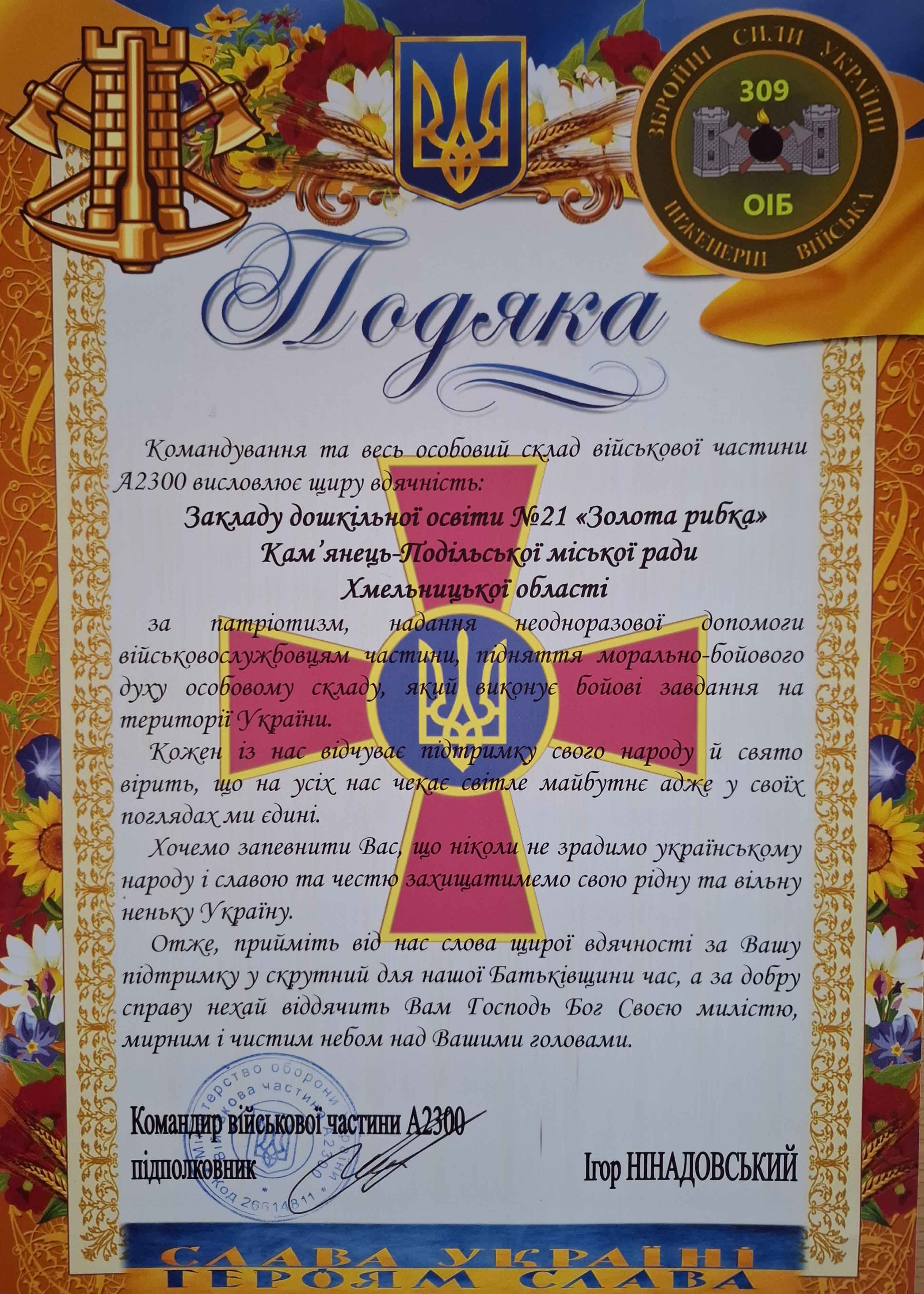 До Дня захисників та захисниць України у закладі дошкільної освіти №21 «Золота рибка» відбувся збір допомоги відважним воїнам. За підсумками педагогічно-батьківського донату зібрано 14 500 грн та необхідні речі для ЗСУ.